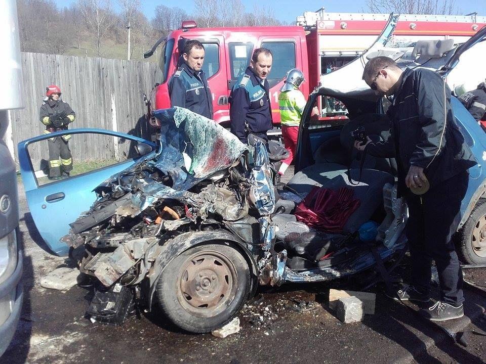 ACCIDENT TERIBIL la Bacău. Un autoturism a fost făcut PRAF de o basculantă. O femeie și un copil de 11 ani, duși de urgență la spital