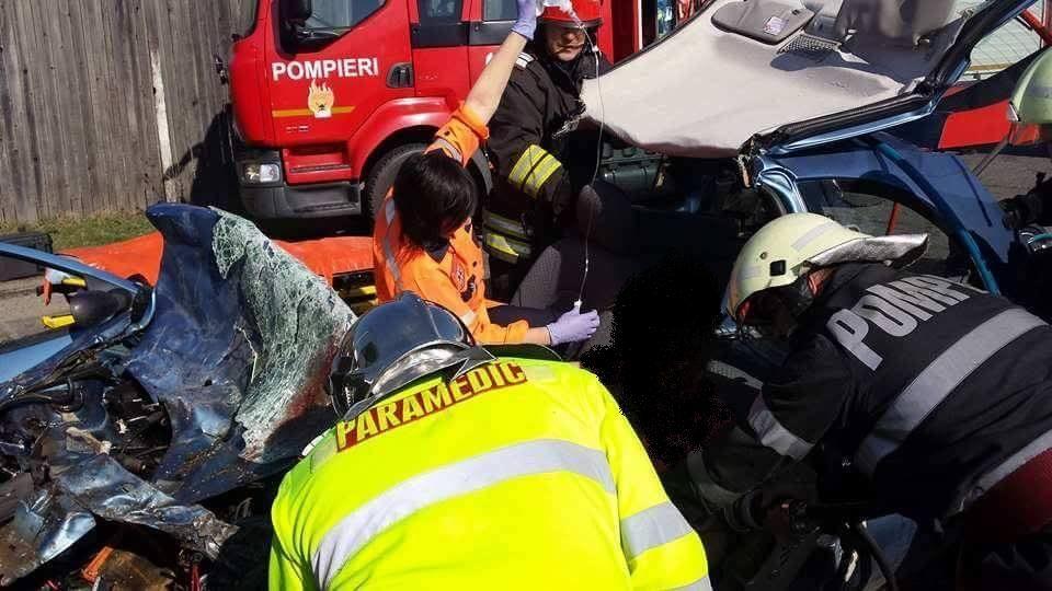 ACCIDENT TERIBIL la Bacău. Un autoturism a fost făcut PRAF de o basculantă. O femeie și un copil de 11 ani, duși de urgență la spital