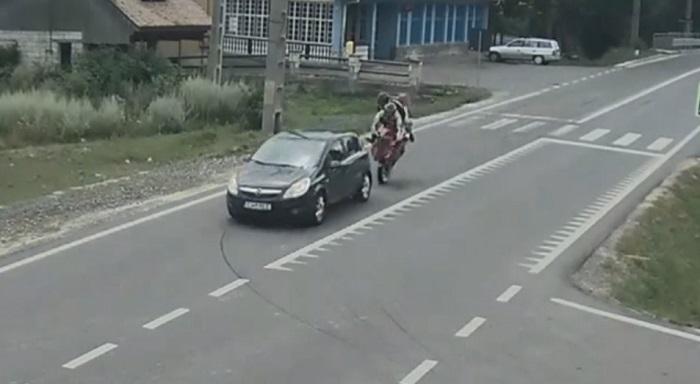 Accident uluitor în Mureș: un motociclist și pasagerul său zboară peste o mașină, după un impact violent