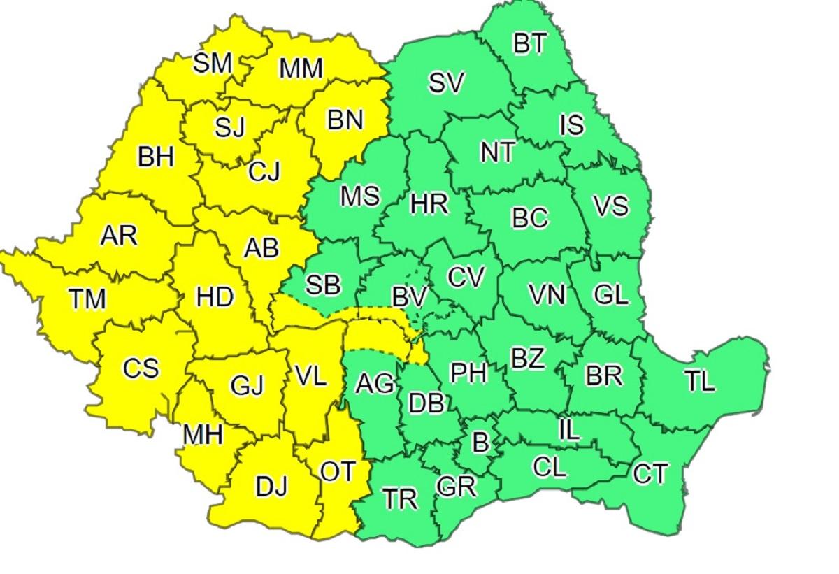 Zeci de judeţe sub cod galben de ploi torenţiale, grindină şi furtuni, până sâmbătă seară