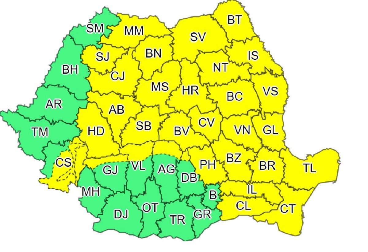Zeci de judeţe sub cod galben de ploi torenţiale, grindină şi furtuni, până sâmbătă seară