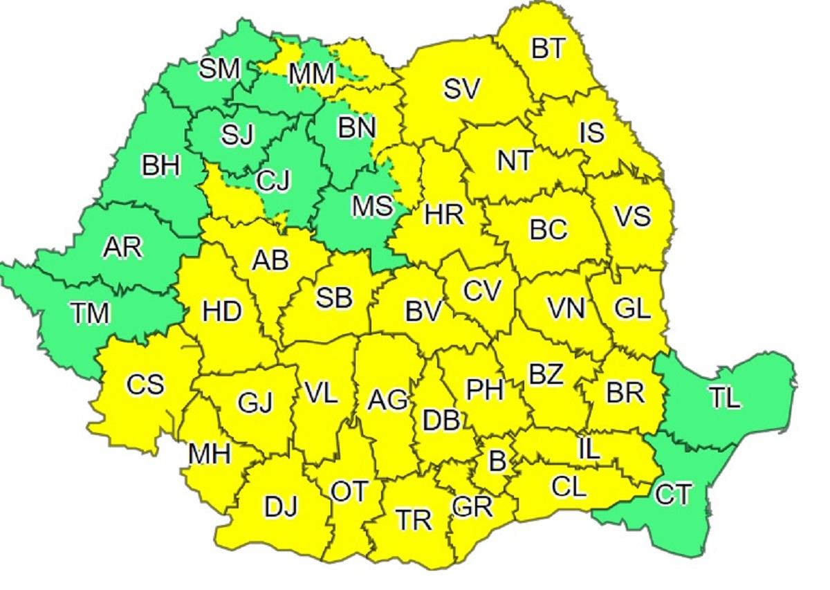 Alertă de ploi torenţiale, grindină şi vijelii. 33 de judeţe şi Capitala, sub cod galben de vreme severă