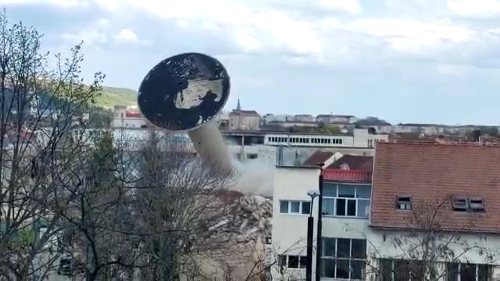 "Am avut mari emoţii, casa noastră este chiar lângă". Turn de apă din Oradea de peste 30 de metri, pus la pământ de o explozie controlată