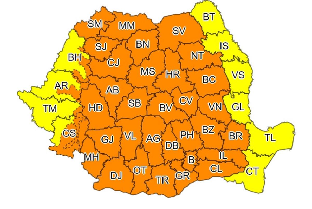 Harta județelor afectate de codurile galben și portocaliu | Sursa foto: meteoromania.ro
