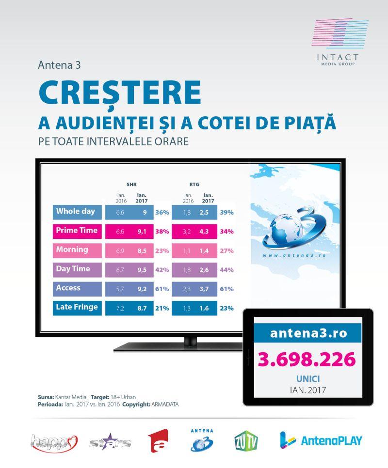 Antenele, creșteri importante pe întreaga zi și în prime time, pe toate segmentele de public, în prima lună a anului 2017