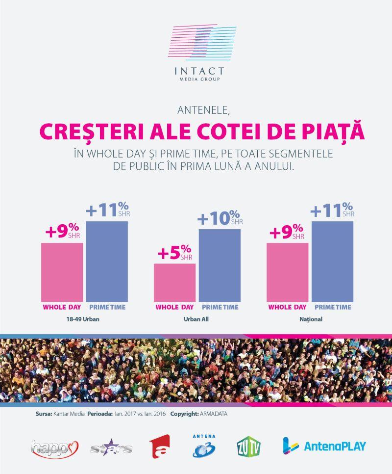 Antenele, creșteri importante pe întreaga zi și în prime time, pe toate segmentele de public, în prima lună a anului 2017