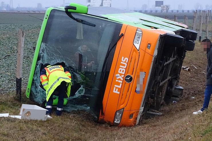 Autocar românesc răsturnat în Ungaria! Șoferul a adormit la volan, în timp ce se întorcea din Franța. Nouă persoane erau la bord (Foto)