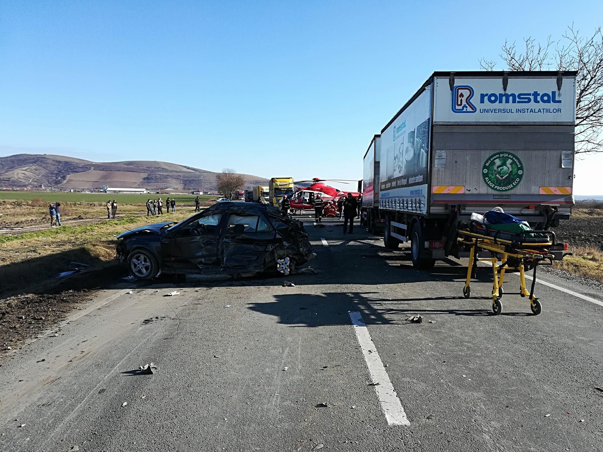 Un autoturism a fost strivit de două TIR-uri în Arad. Doi bărbaţi au rămas prinşi între fiarele contorsionate (Foto)