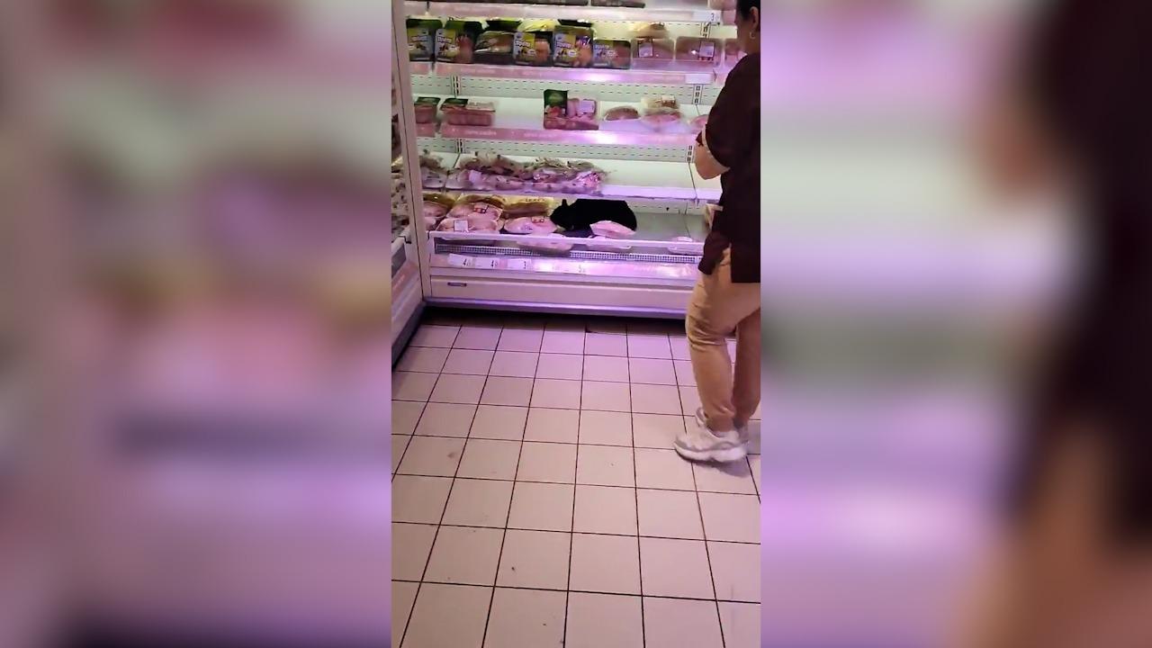 "Bagă, fata mea, bagă!" O pisică surprinsă mâncând dintr-o caserolă în vitrina unui supermarket din București