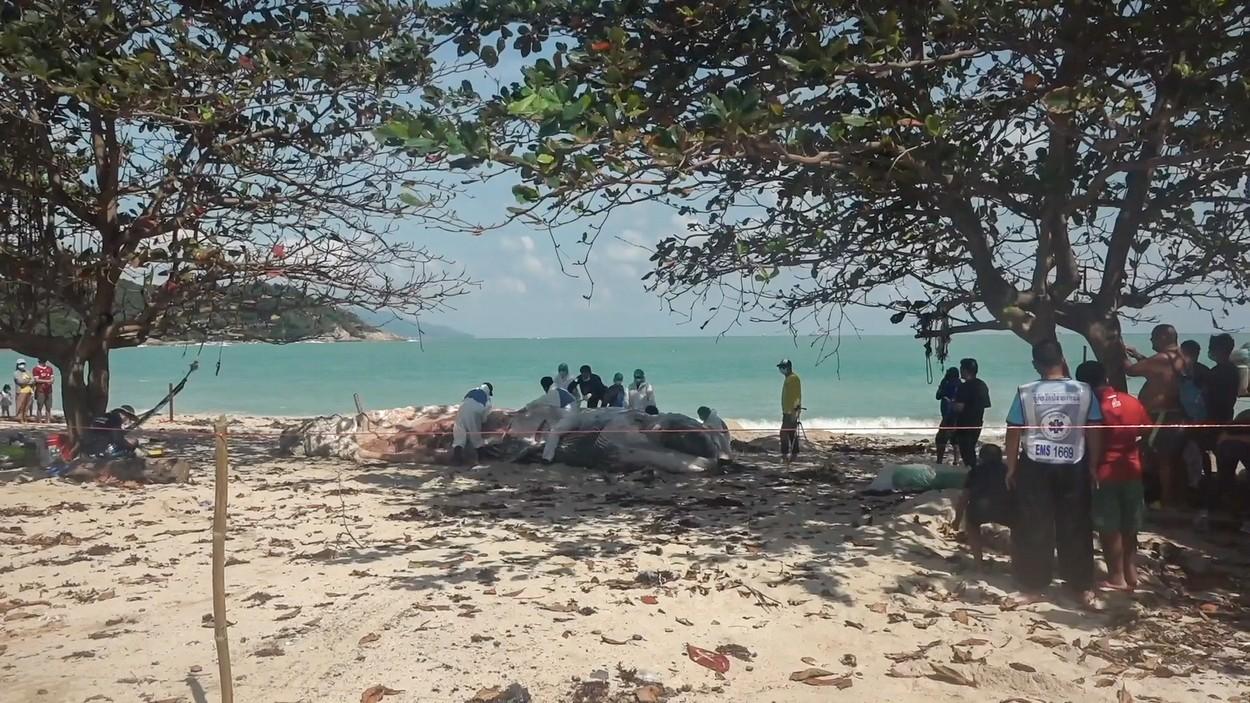 Balenă uriaşă, descoperită moartă pe o plajă din Thailanda. Pentru ridicarea sa a fost nevoie de un buldoexcavator | Sursa foto: Profimedia
