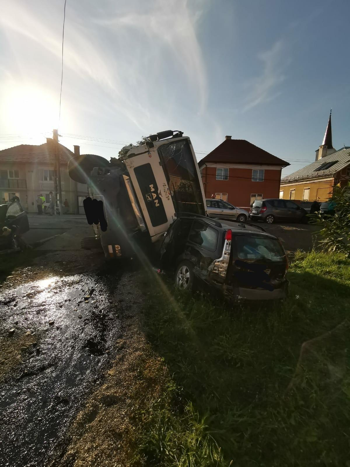 O basculantă plină cu piatră a spulberat 9 mașini oprite la semafor, în Bistrița (Video)