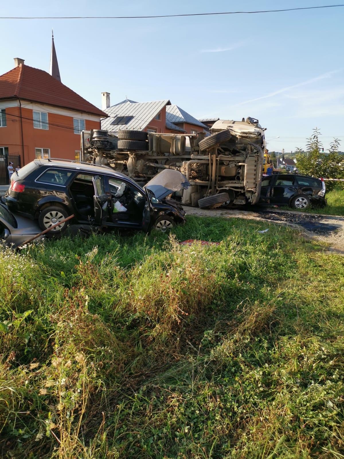 O basculantă plină cu piatră a spulberat 9 mașini oprite la semafor, în Bistrița (Video)