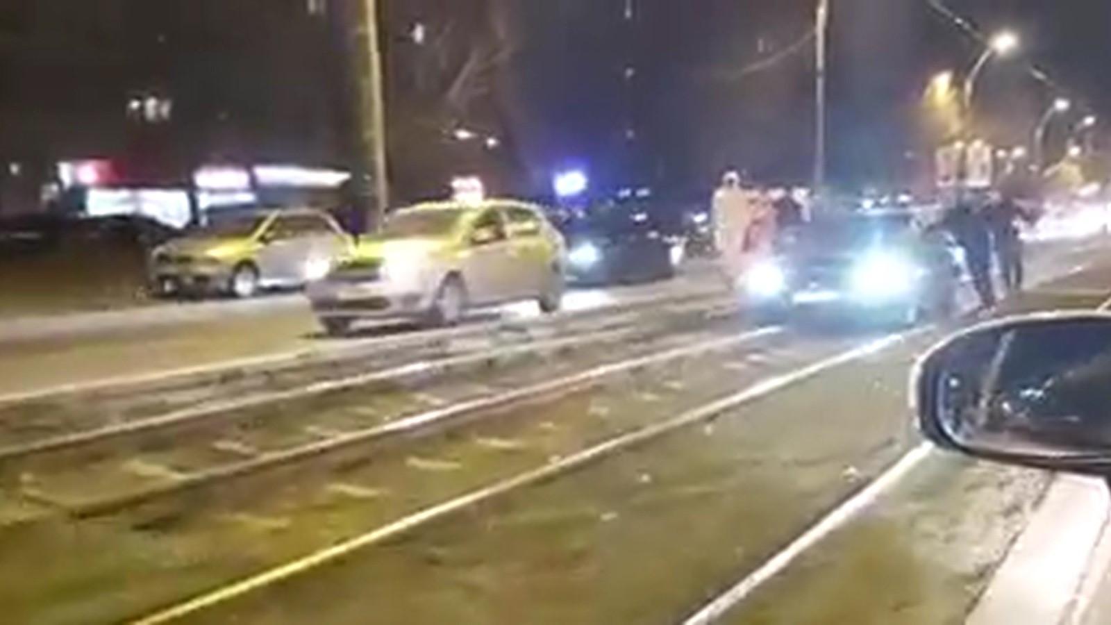 BMW blocat pe șina de tramvai în Rahova. Șoferul a vrut să evite statul în coloană, dar a omis bordura