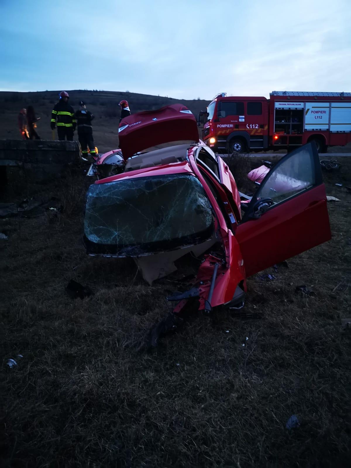 BMW despicat în jumătate, la impactul cu un cap de pod, în Vaslui. Şoferul a tras doar o sperietură