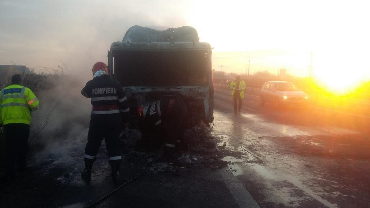 BMW făcut scrum pe autostrada A1 Bucureşti - Piteşti. Un trailer care transporta maşini de lux a luat foc în mers