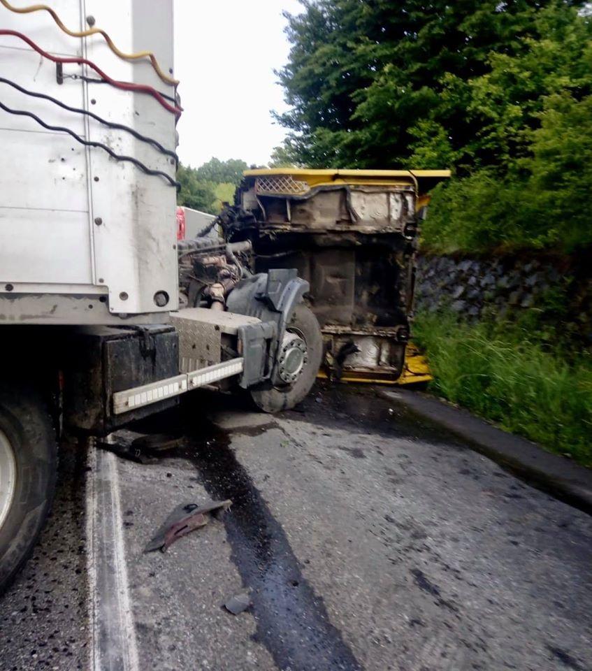 Cabină de TIR ruptă de pe șasiu și împrăștiată pe șosea, la Ohaba, în Hunedoara