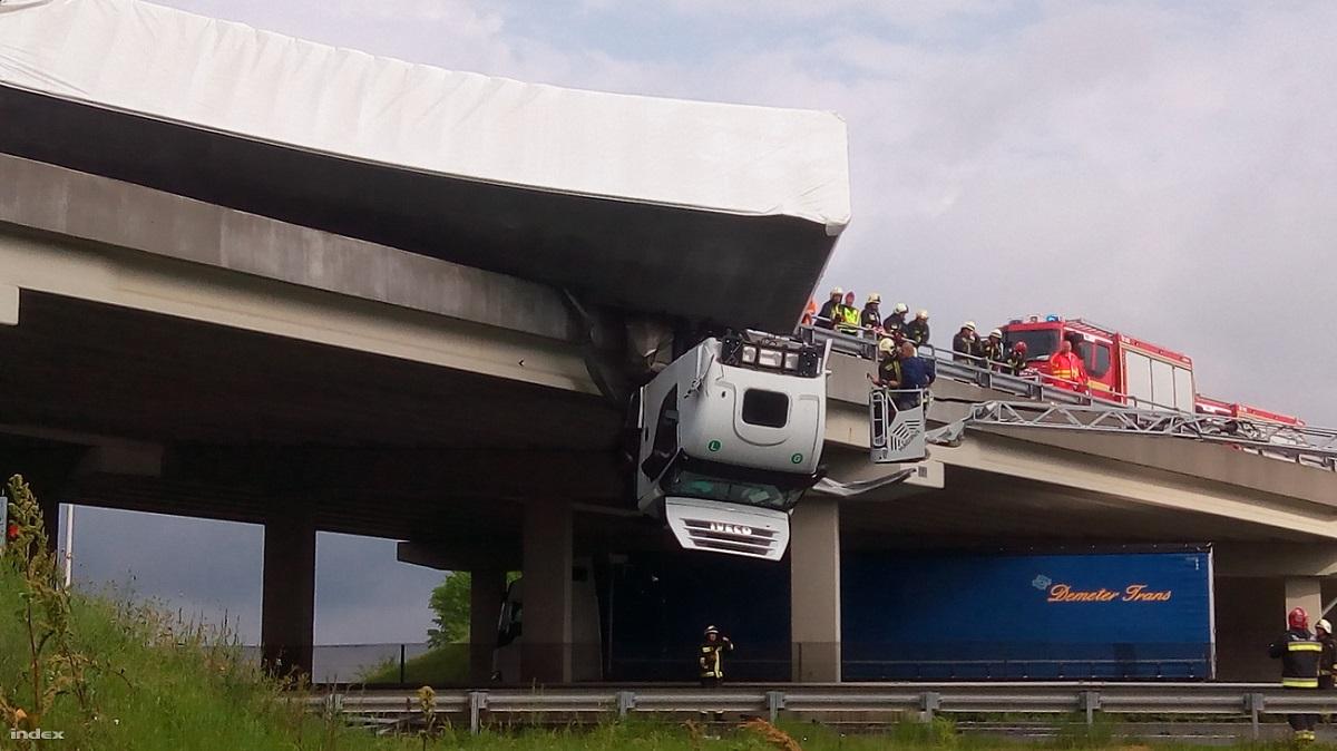 Cabină de TIR suspendată peste autostradă, camionul a fost aruncat de vânt peste parapet, în Ungaria