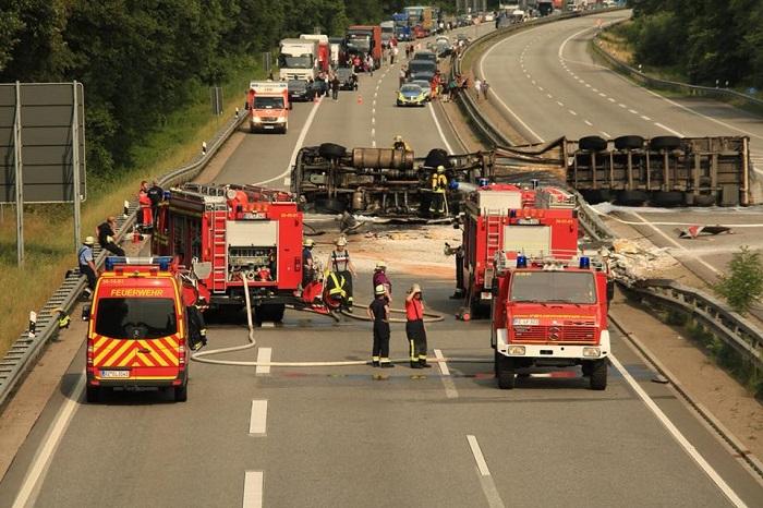 Imagini cumplite. Un camion a ars complet, după ce i-a explodat un cauciuc, pe o autostradă din Germania (video)