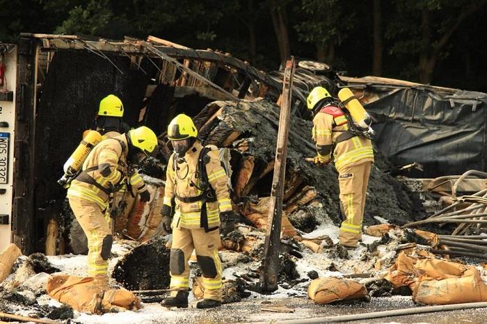 Imagini cumplite. Un camion a ars complet, după ce i-a explodat un cauciuc, pe o autostradă din Germania (video)