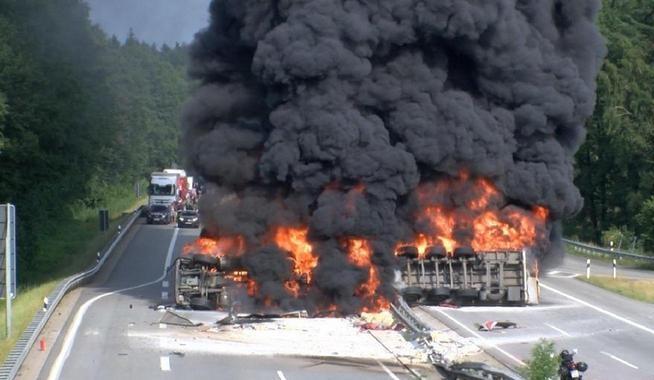 Imagini cumplite. Un camion a ars complet, după ce i-a explodat un cauciuc, pe o autostradă din Germania (video)
