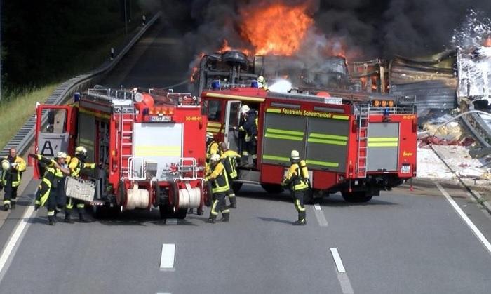 Imagini cumplite. Un camion a ars complet, după ce i-a explodat un cauciuc, pe o autostradă din Germania (video)