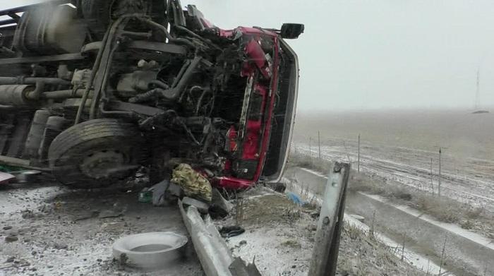 Camion răsturnat în judeţul Braşov, din cauza poleiului de pe carosabil! Şoferul a fost prins între fiarele contorsionate | Imagini dramatice