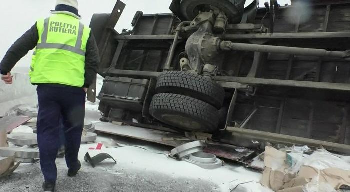 Camion răsturnat în judeţul Braşov, din cauza poleiului de pe carosabil! Şoferul a fost prins între fiarele contorsionate | Imagini dramatice