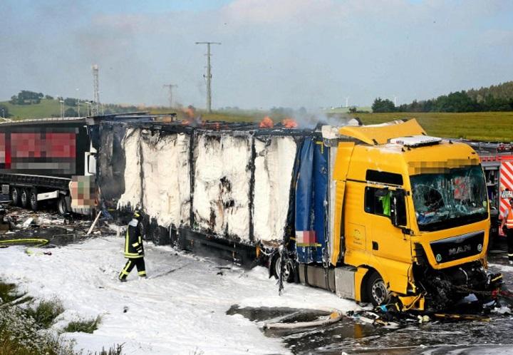Imagini de groază pe o autostradă, după un carambol cu patru TIR-uri. Un șofer a murit, strivit în cabină