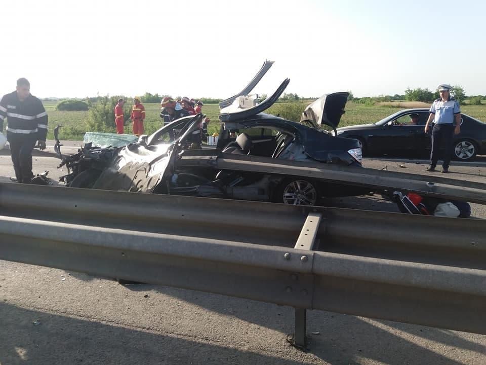 Carnagiu pe A1. Şoferul unui Mercedes are ambele picioare retezate, pasagerul rănit, motociclistul ambele mâini fracturate (Video)