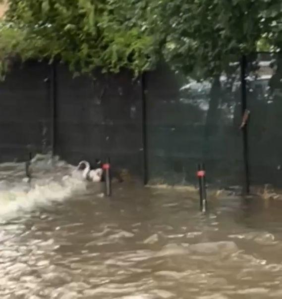 Căţeluş, surprins de codul portocaliu de furtuni pe o stradă inundată din Popeşti-Leordeni. Patrupedul a oferit o lecţie de viaţă pentru supravieţuire