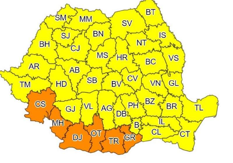 Cod portocaliu de vreme severă în mai multe judeţe din sudul ţării, de la ora 12.00. Avertizare meteo şi pentru Bucureşti
