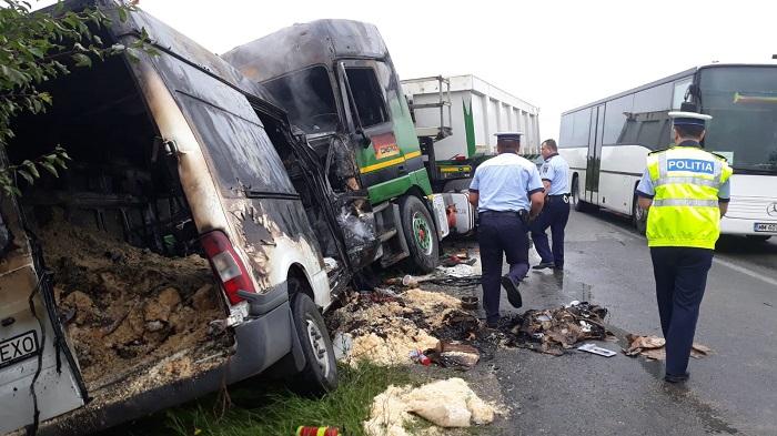Microbuzul care a ars în Maramureş, după ce s-a izbit de un camion, filmat în flăcări. Şoferul a rămas încarcerat, a fost scos din maşină ars (video)