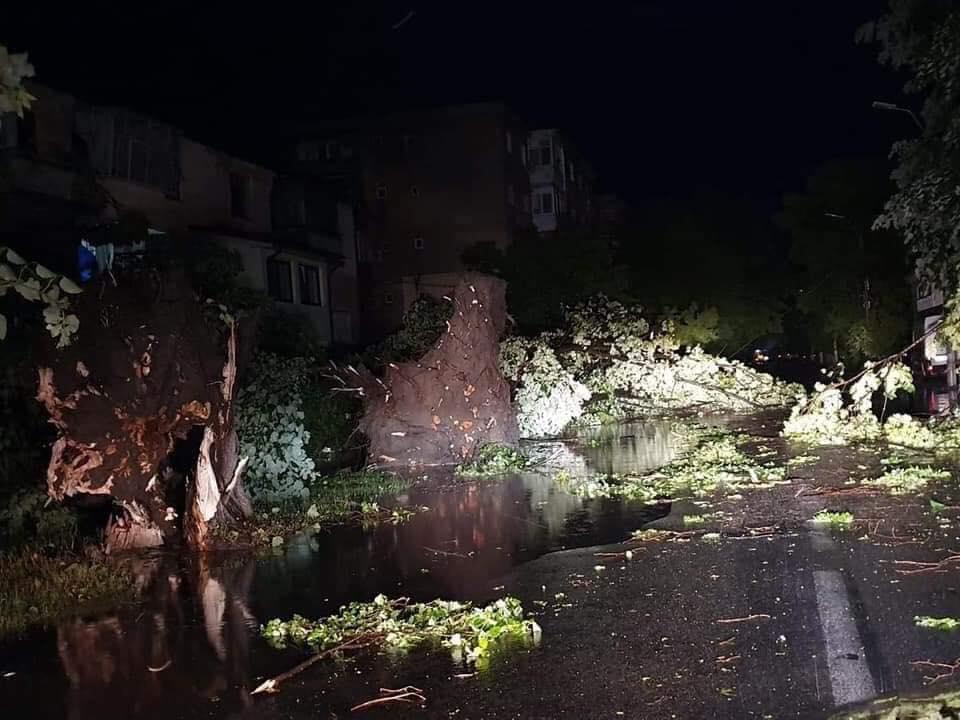 Copaci imenşi smulşi din rădăcini, la Corabia, de furtuna care a lovit oraşul miercuri seara