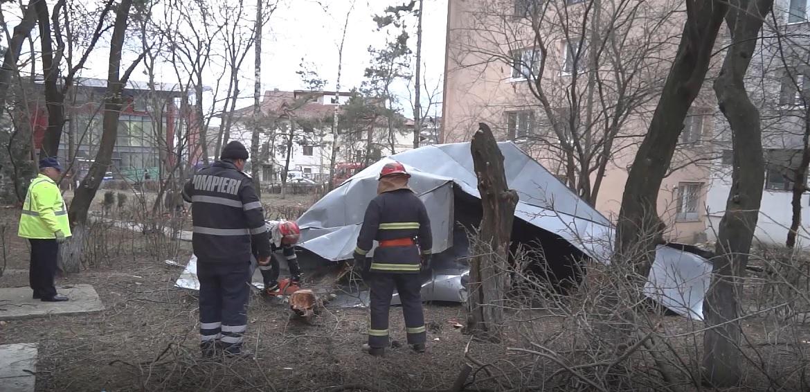 Vântul face ravagii, la Suceava. Un copac a strivit o maşină, cei doi pasageri au ajuns la spital (FOTO)