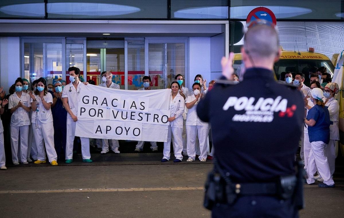 Poliţiştii aplaudă cadrele medicale la spitalul Rey Juan Carlos, Spania | Sursa foto: Profimedia
