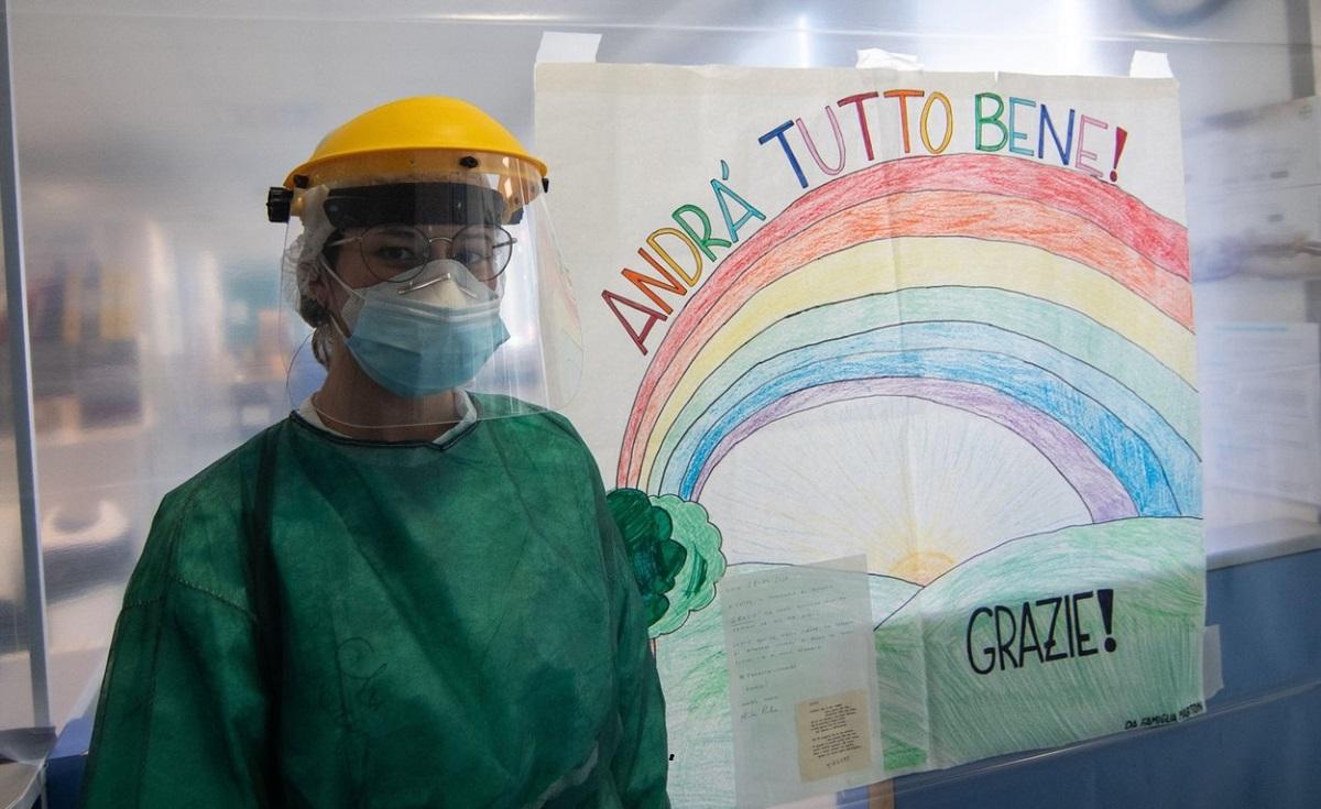 Un cadru medical stă lângă un semn pe care este scris "Totul va fi bine" alături de un curcubeu la Spitalul din Dolo | Sursa foto: Profimedia