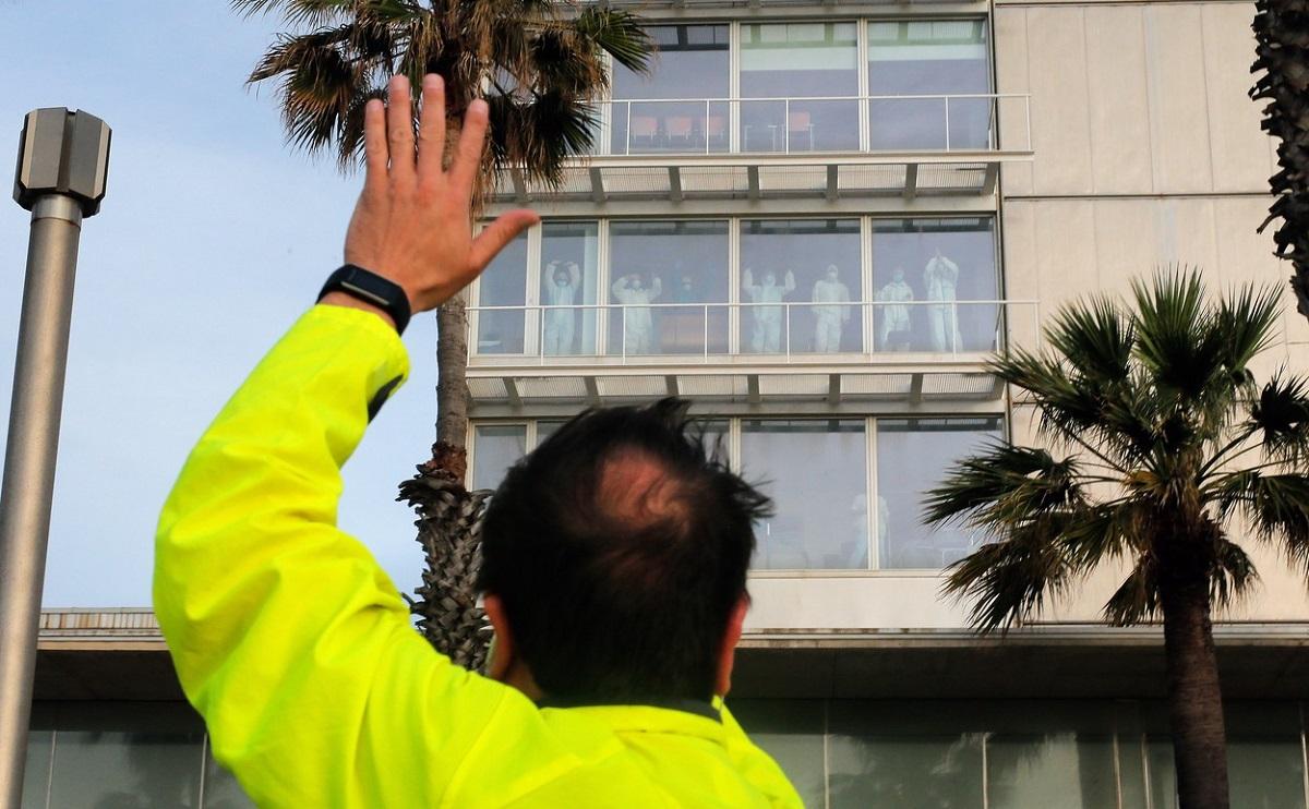 Un bărbat salută cadrele medicale aflate la geamul Spitalului del Mar din Barcelona | Sursa foto: Profimedia