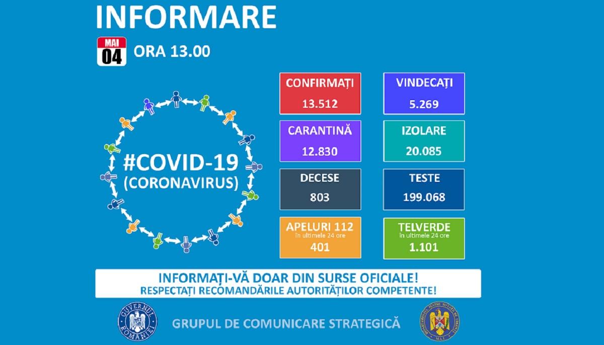 Coronavirus, 4 mai. 818 decese şi 13.512 de îmbolnăviri în România