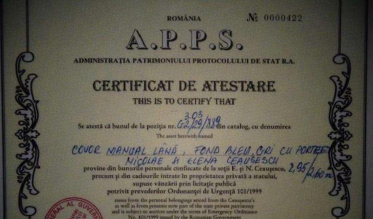 Certificatul autentic al covorului cu portretul celor doi soţi Ceauşescu | Sursa foto: OLX.ro