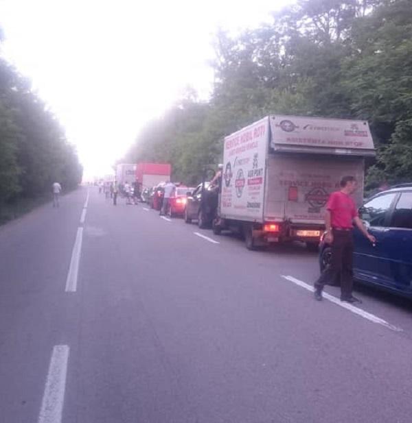 Cozi uriașe pe DN 2, la Sineşti, după ce o cisternă încărcată cu bitum s-a răsturnat