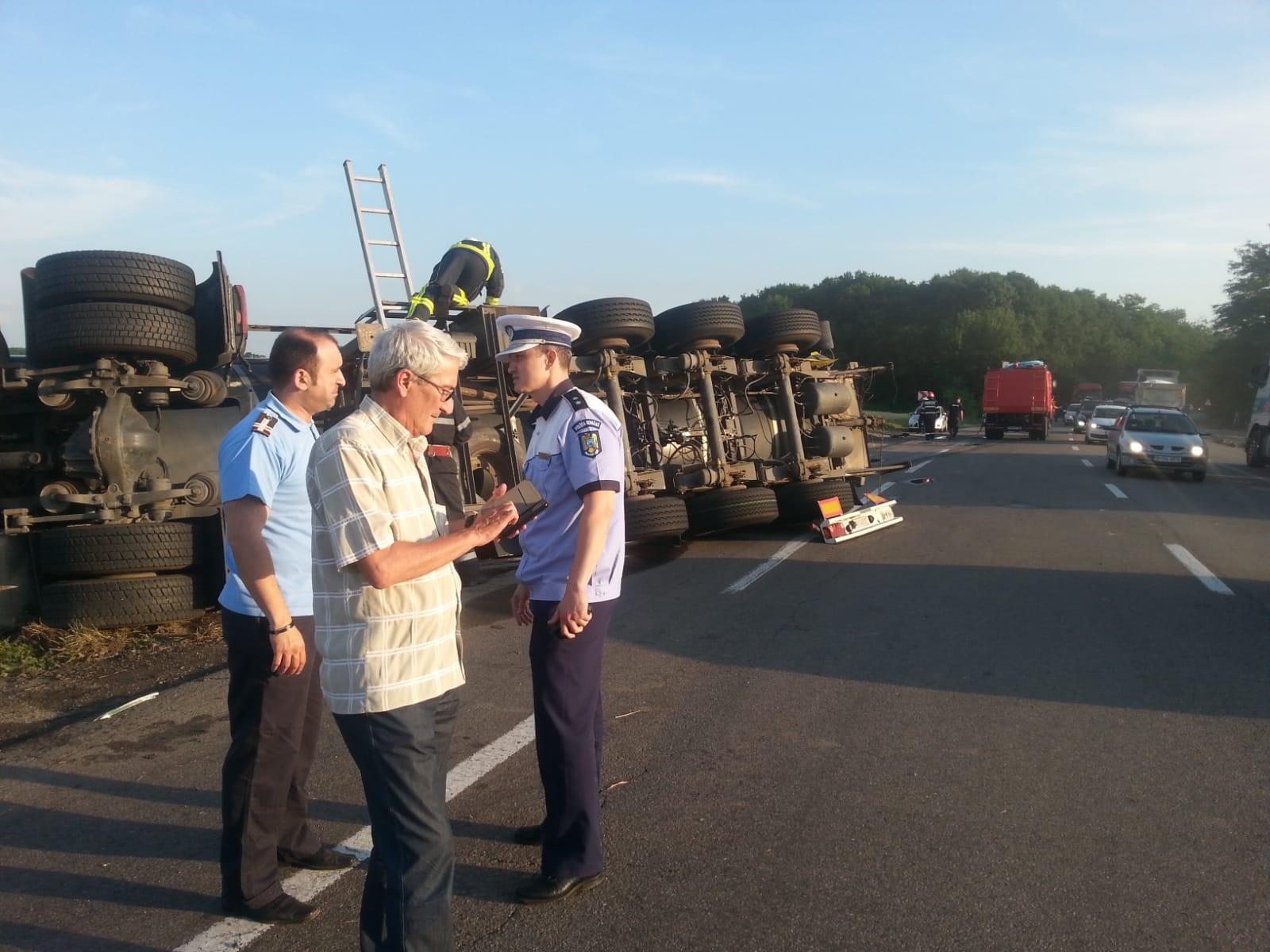 Cozi uriașe pe DN 2, la Sineşti, după ce o cisternă încărcată cu bitum s-a răsturnat