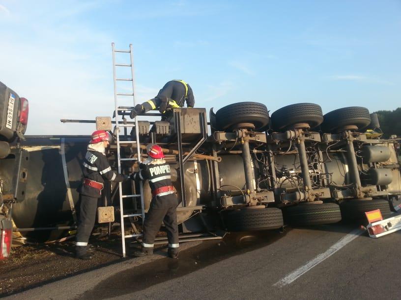 Cozi uriașe pe DN 2, la Sineşti, după ce o cisternă încărcată cu bitum s-a răsturnat