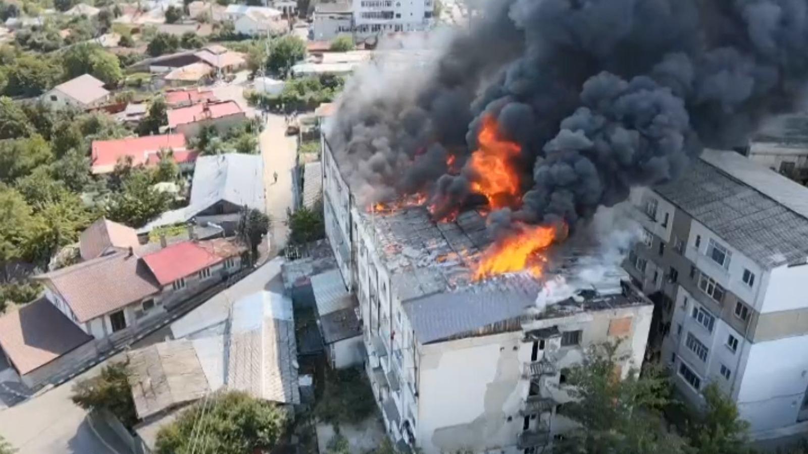 "Cum e casa mea. Doamne, nu mai pot!" Acoperişul unui bloc din Huşi distrus complet, după ce a luat foc din senin: 20 de locuinţe vor avea nevoie de reparaţii
