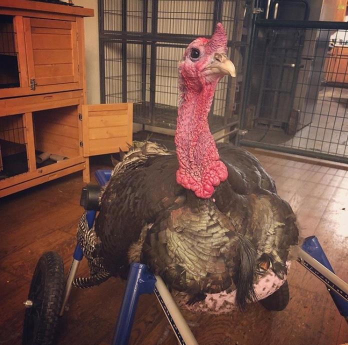 Curcanul Bill, tăiat la piciorul drept, învață să meargă din nou, într-un scaun cu rotile (video)
