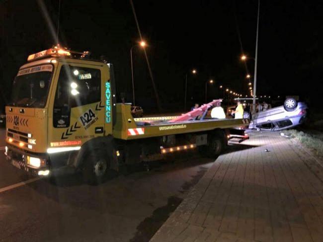 Cursă de maşini cu viteze ameţitoare şi impact devastator! A izbit în plin un Passat, i-a sărit roata, s-a răsturnat şi a rupt un stâlp de electricitate