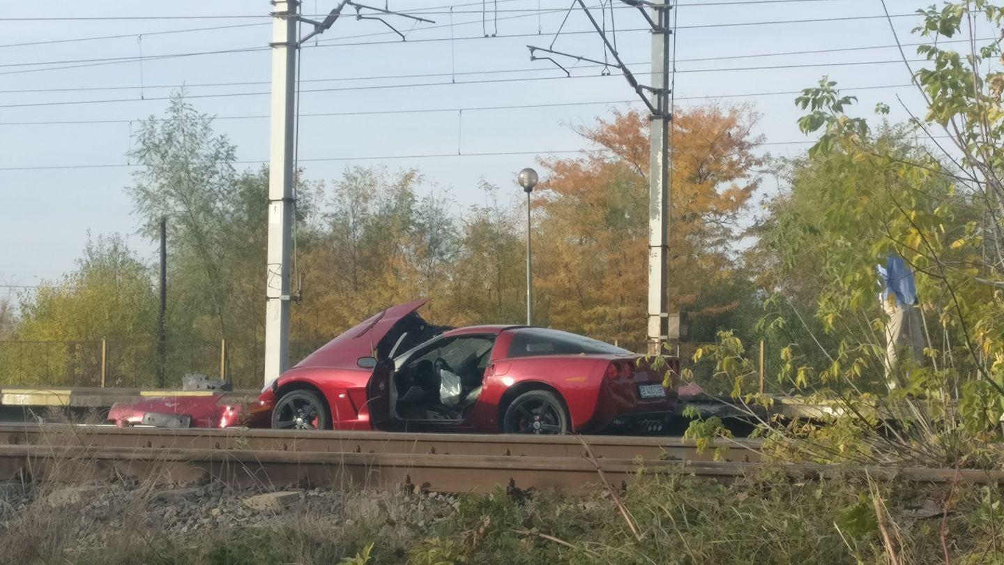 Cursă ilegală între un Corvette şi un Jaguar! Unul dintre bolizi a ZBURAT peste calea ferată şi s-a izbit de peronul gării din Buftea - GALERIE FOTO