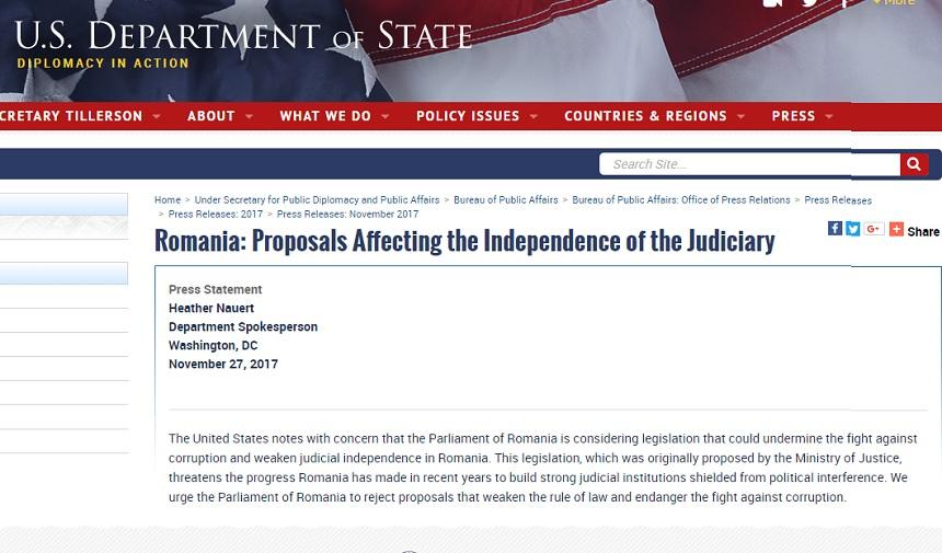 Departamentul de Stat al SUA cere Parlamentului României să respingă propunerile legislative care afectează statul de drept şi lupta anticorupţie