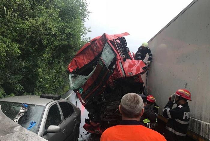 Dezastru pe şosea, la Milova, în Arad. Accident cu două TIR-uri şi un autoturism, şoferul unuia dintre camioane e încarcerat