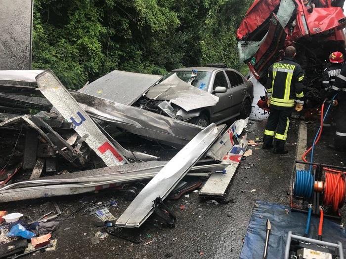 Dezastru pe şosea, la Milova, în Arad. Accident cu două TIR-uri şi un autoturism, şoferul unuia dintre camioane e încarcerat