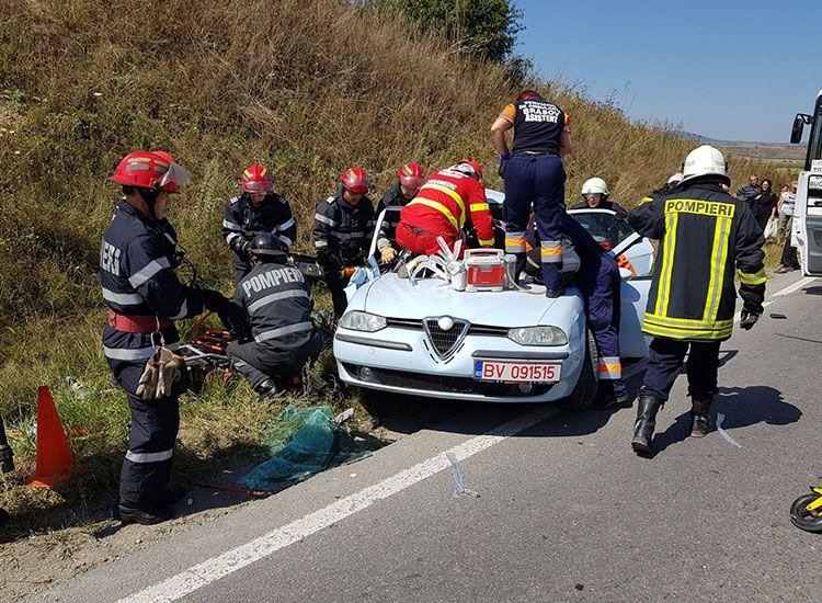 Doi oameni au rămas ÎNCARCERAŢI după ce o maşină a fost SPULBERATĂ de un AUTOCAR - FOTO/VIDEO